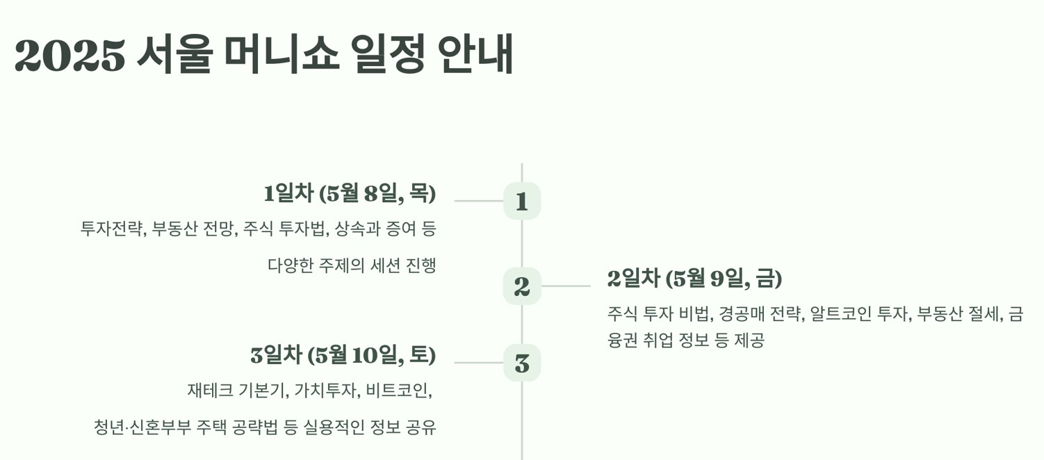 2025년 서울머니쇼는 특히 디지털 금융과 ESG 투자에 초점을 맞추었습니다. 참가자들은 최신 금융 기술을 체험하고, 지속 가능한 투자에 대한 정보를 얻을 수 있었습니다. 또한, 다양한 세미나와 워크숍을 통해 실전 투자 전략을 배울 수 있는 기회가 제공되었습니다.