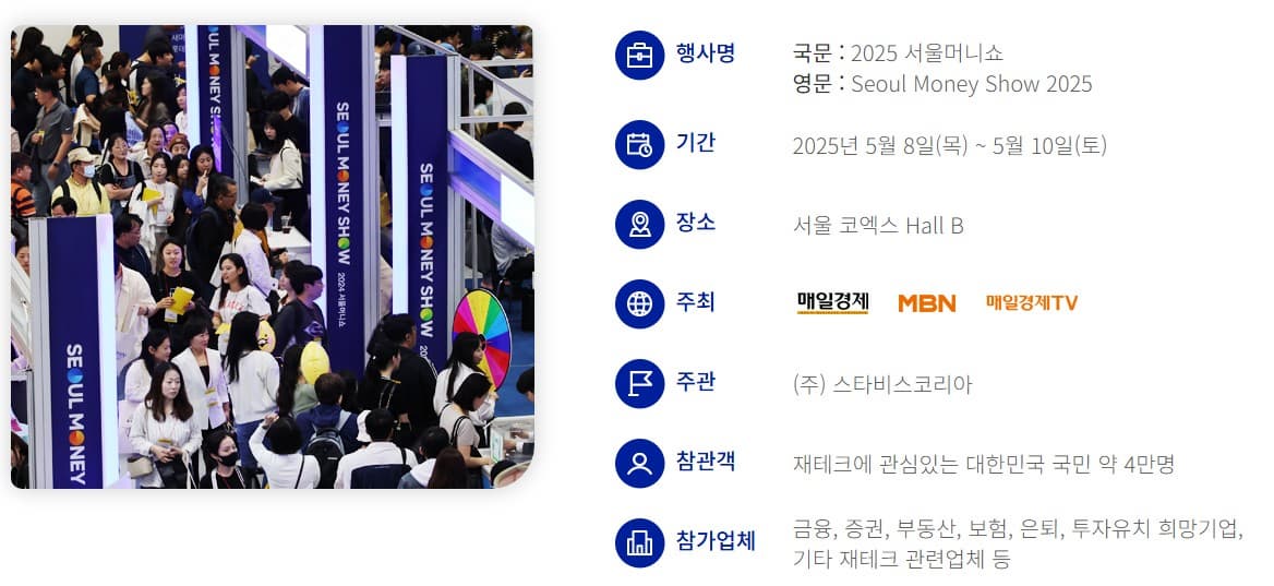 2025 서울 머니쇼는 대한민국 최대 규모의 재테크 박람회로, 올해로 16회를 맞이했습니다. 매일경제에서 주최하는 서울 머니쇼는 , 다양한 금융 기관과 전문가들이 참여하여 재테크, 투자, 자산 관리 등 다양한 금융 정보를 제공합니다. 매년 수많은 참가자들이 최신 금융 트렌드를 배우고, 실질적인 재테크 전략을 얻기 위해 이곳을 찾고 있습니다.